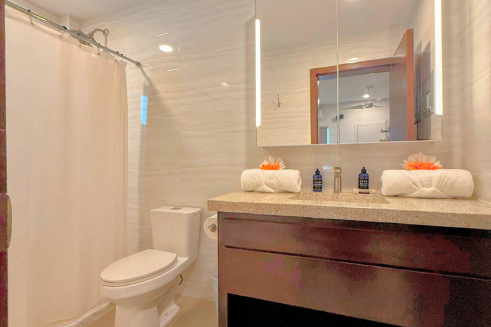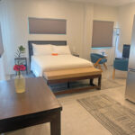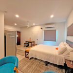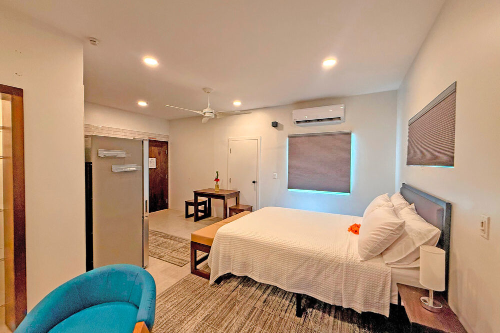 Relax in our modern 1-Bedroom Studio Apartment (1A) with queen-sized bed and a private bathroom, designed to provide the perfect retreat and sanctuary to unwind and rejuvenate after a day of adventure in San Pedro.